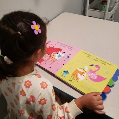 We use a variety of developmentally appropriate methods of instruction, such as speaking games, shared reading time, creative activities, journal notebooks, and more.