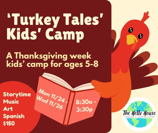 Our Turkey Tales Camp is for kids ages 5-8 and takes place the week of Thanksgiving: Monday 11/24, Tuesday 11/25, and Wednesday 11/26. Hours: 8:30am-3:30pm. Cost: $150/child. Children should bring a packed lunch each day.